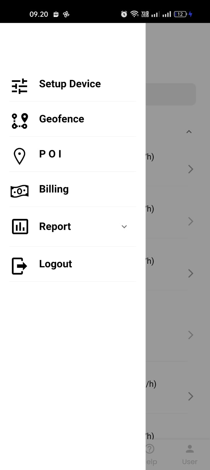 Pertama silahkan log in di aplikasi IDTRACK anda, kemudian klik menu home,lalu tekan garis 3 pada bagian pojok kiri atas pada layar aplikasi.