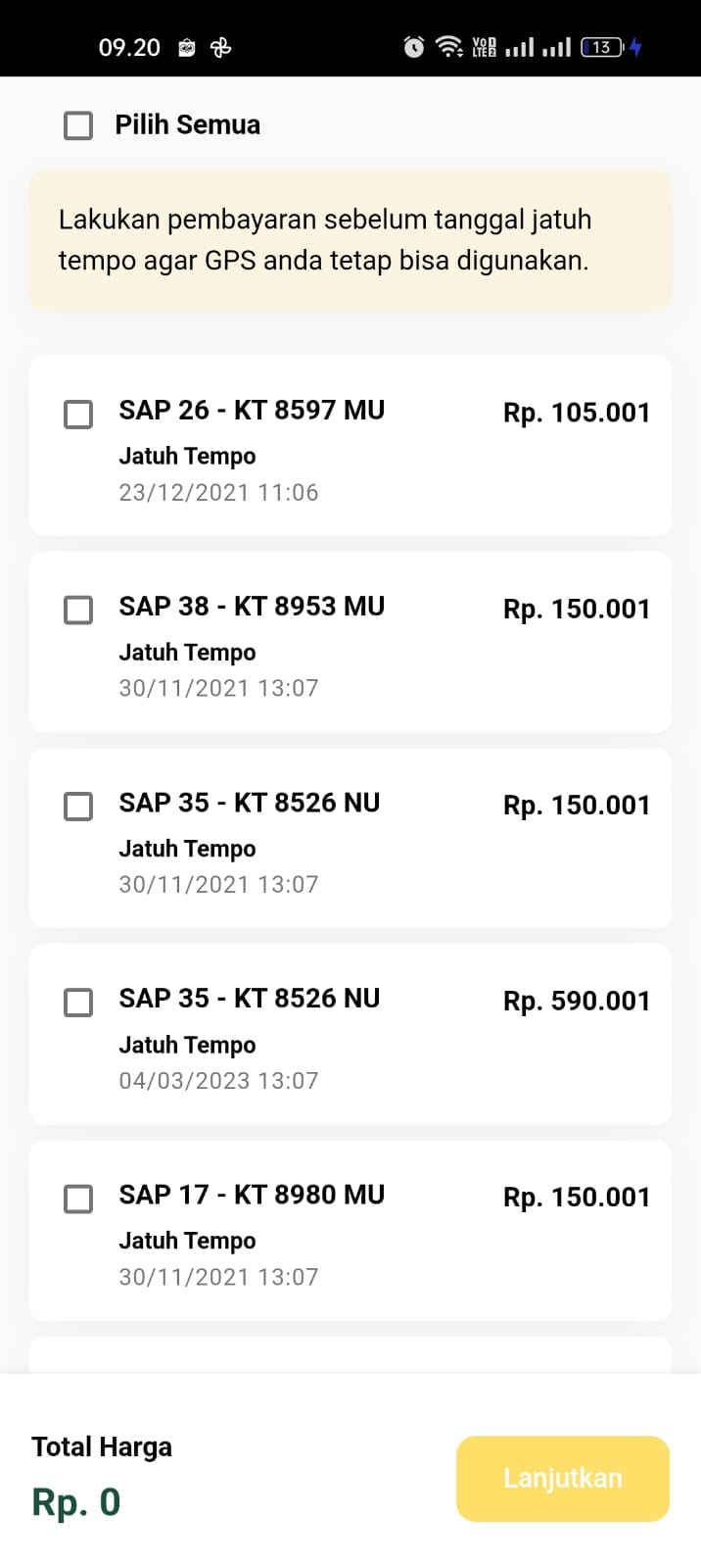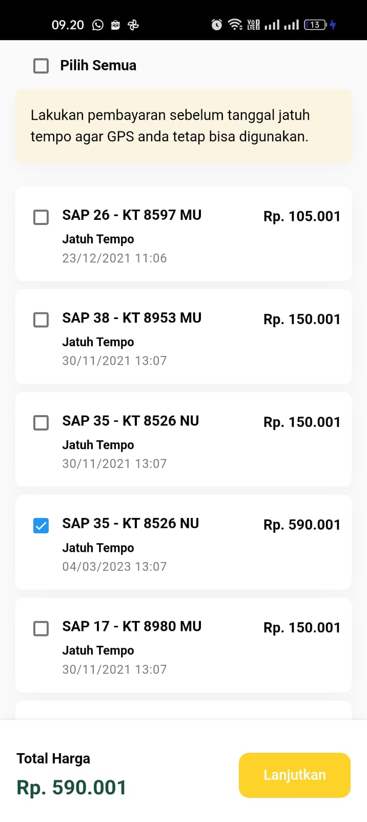 Silahkan pilih Device/Nopol yang akan di perpanjang, lalu akan muncul Total harga tekan lanjutkan